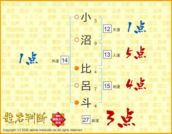 小(3画)沼(9画) 比(4画)呂(7画)斗(4画)