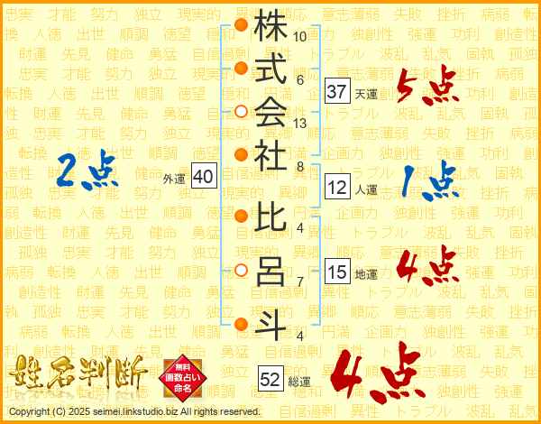 株(10画)式(6画)会(13画)社(8画) 比(4画)呂(7画)斗(4画)