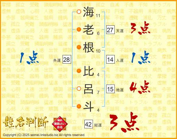 海(11画)老(6画)根(10画) 比(4画)呂(7画)斗(4画)