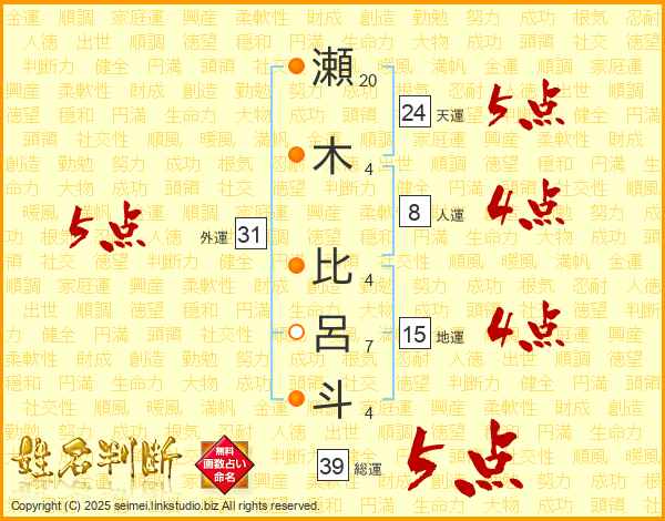 瀬(20画)木(4画) 比(4画)呂(7画)斗(4画)