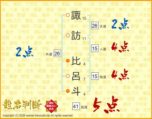 諏(15画)訪(11画) 比(4画)呂(7画)斗(4画)
