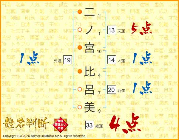 二ノ宮比呂美さんの総運は33画の4点!