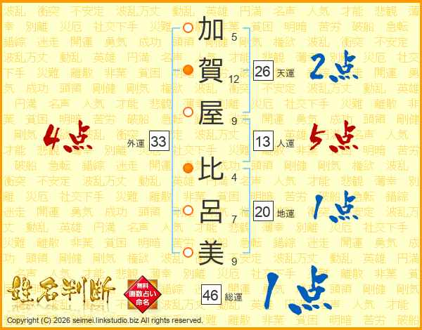 加(5画)賀(12画)屋(9画) 比(4画)呂(7画)美(9画)