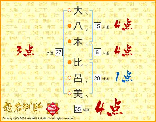 大(3画)八(8画)木(4画) 比(4画)呂(7画)美(9画)