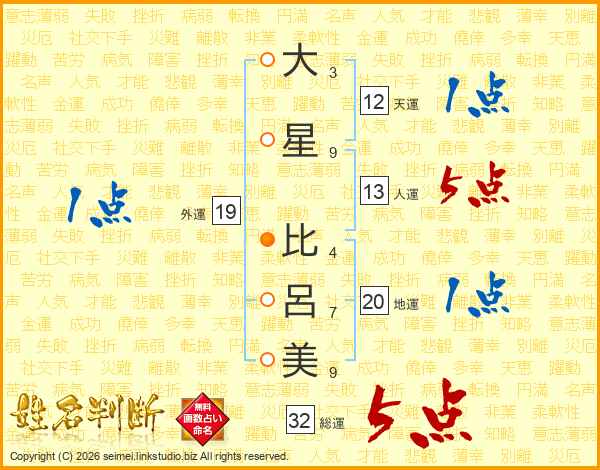 大(3画)星(9画) 比(4画)呂(7画)美(9画)