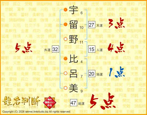 宇(6画)留(10画)野(11画) 比(4画)呂(7画)美(9画)