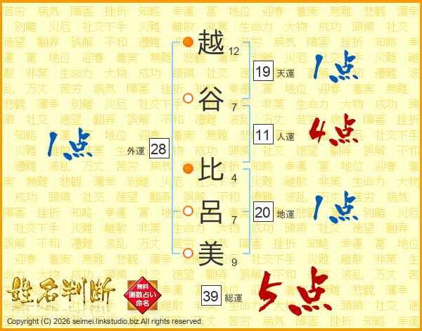 越(12画)谷(7画) 比(4画)呂(7画)美(9画)