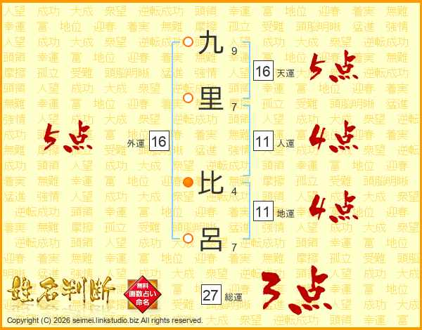 九(9画)里(7画) 比(4画)呂(7画)