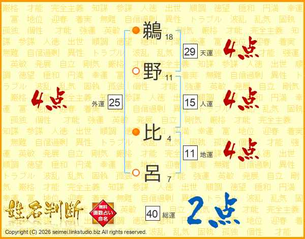鵜野比呂さんの天運は29画の4点!