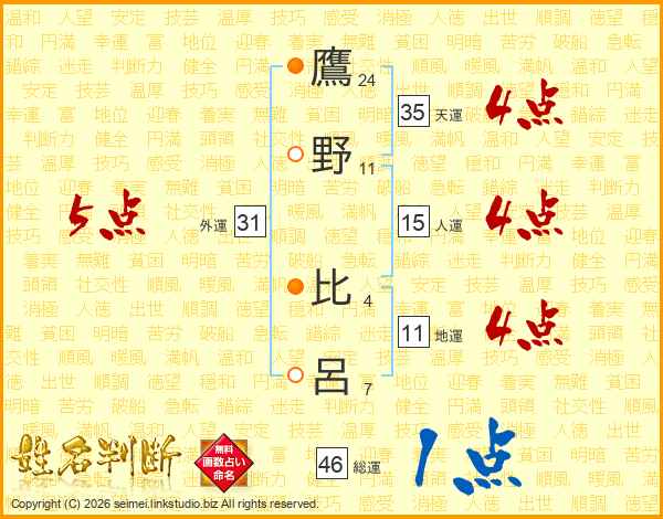 鷹(24画)野(11画) 比(4画)呂(7画)