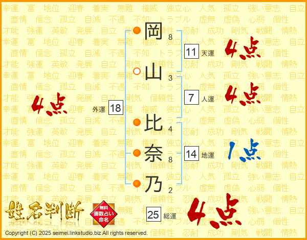 岡山比奈乃さんの天運は11画の4点!