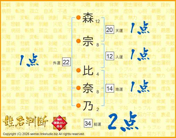森宗比奈乃さんの総運は34画の2点!