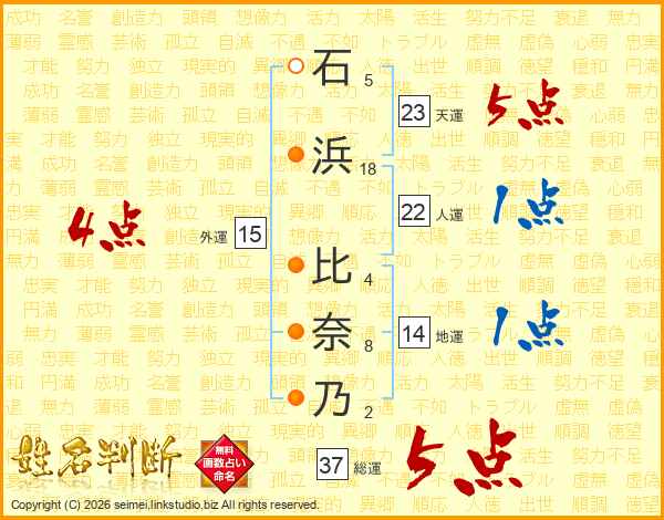 石(5画)浜(18画) 比(4画)奈(8画)乃(2画)