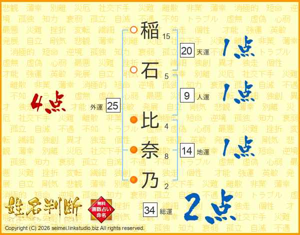 稲(15画)石(5画) 比(4画)奈(8画)乃(2画)