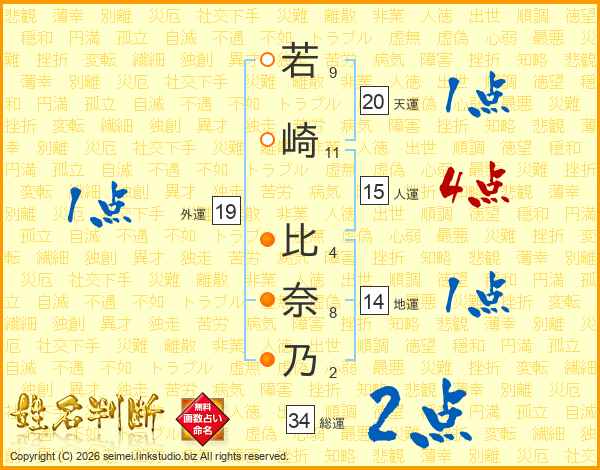 若(9画)崎(11画) 比(4画)奈(8画)乃(2画)