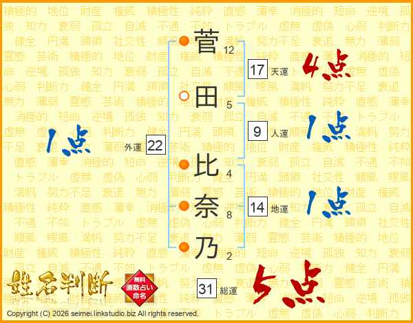 菅(12画)田(5画) 比(4画)奈(8画)乃(2画)