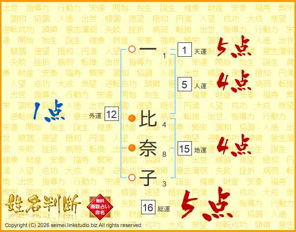 生活面を象徴する運勢です。外部から受ける影響力を表し、結婚運、家庭運や職場、環境への順応性を表します。総運から人運を引いた画数。姓や名が1文字の場合を除く。