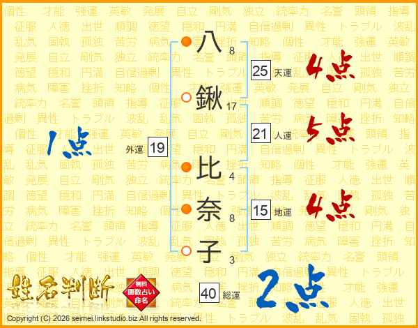 八(8画)鍬(17画) 比(4画)奈(8画)子(3画)