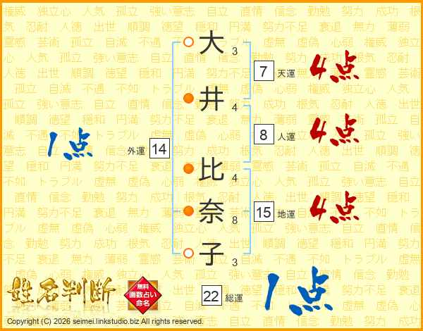 大(3画)井(4画) 比(4画)奈(8画)子(3画)