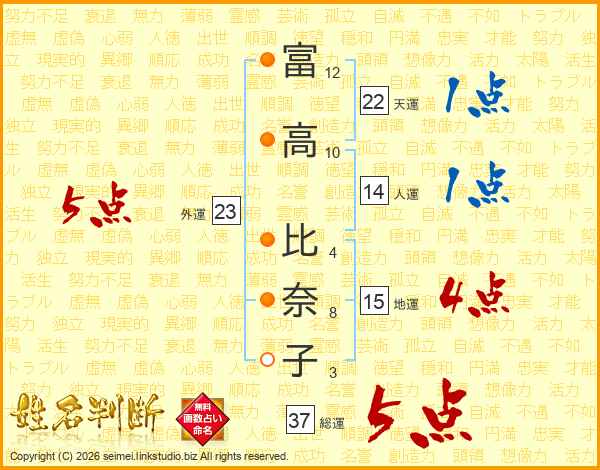 富高比奈子さんの総運は37画の5点!