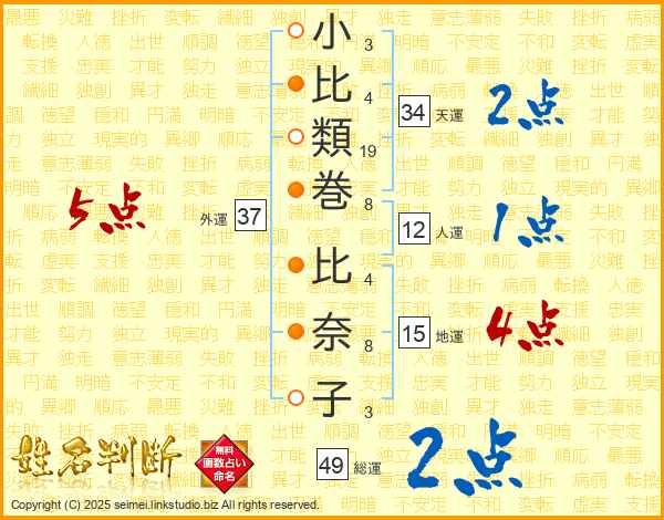 小(3画)比(4画)類(19画)巻(8画) 比(4画)奈(8画)子(3画)