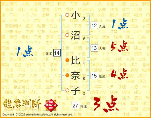 小(3画)沼(9画) 比(4画)奈(8画)子(3画)