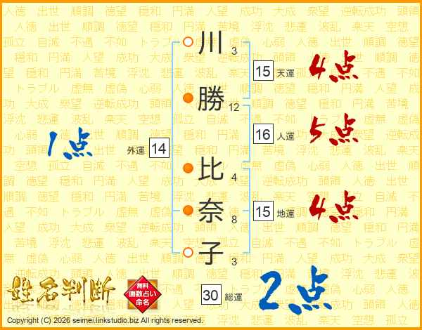 川(3画)勝(12画) 比(4画)奈(8画)子(3画)