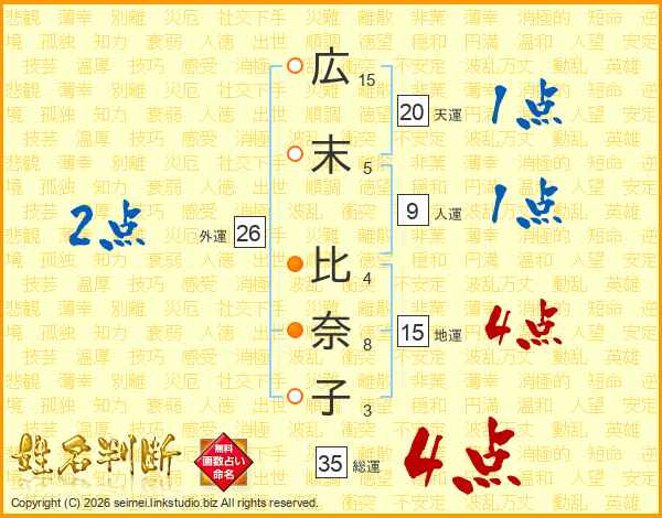 広(15画)末(5画) 比(4画)奈(8画)子(3画)