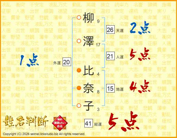 柳(9画)澤(17画) 比(4画)奈(8画)子(3画)