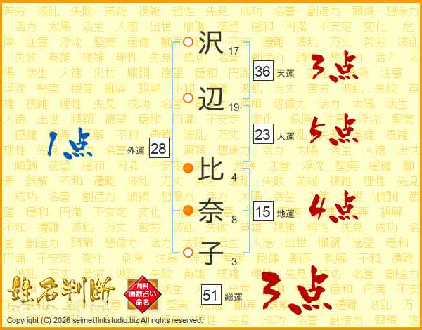 沢(17画)辺(19画) 比(4画)奈(8画)子(3画)