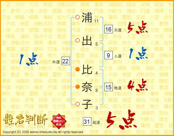 浦(11画)出(5画) 比(4画)奈(8画)子(3画)