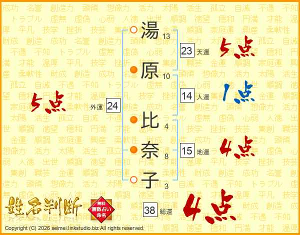 湯原比奈子さんの総運は38画の4点!