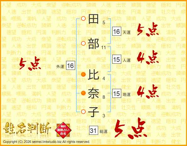 田(5画)部(11画) 比(4画)奈(8画)子(3画)