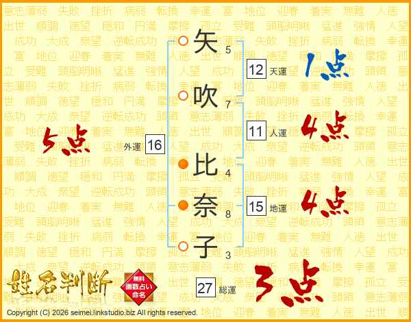 矢(5画)吹(7画) 比(4画)奈(8画)子(3画)