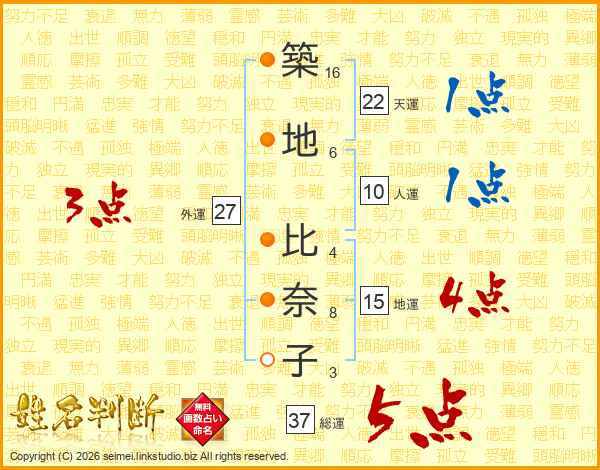 築(16画)地(6画) 比(4画)奈(8画)子(3画)