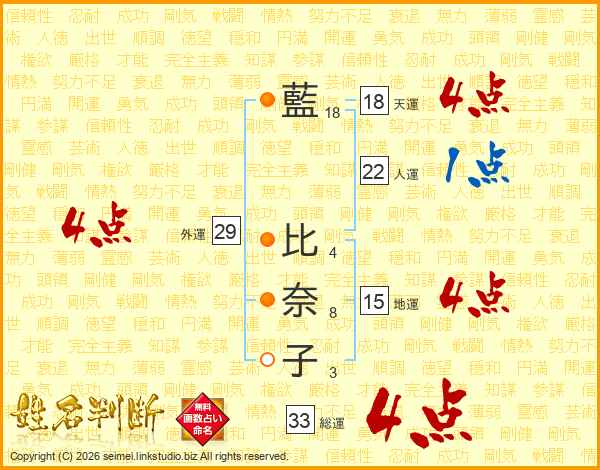藍比奈子さんの総運は33画の4点!