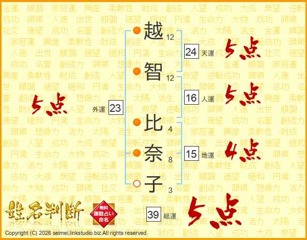越(12画)智(12画) 比(4画)奈(8画)子(3画)