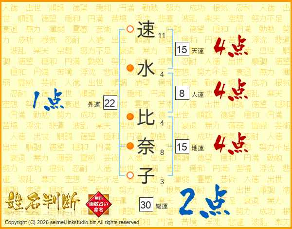 速(11画)水(4画) 比(4画)奈(8画)子(3画)
