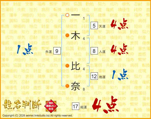 生活面を象徴する運勢です。外部から受ける影響力を表し、結婚運、家庭運や職場、環境への順応性を表します。総運から人運を引いた画数。姓や名が1文字の場合を除く。