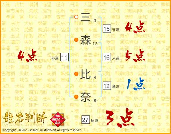 生活面を象徴する運勢です。外部から受ける影響力を表し、結婚運、家庭運や職場、環境への順応性を表します。総運から人運を引いた画数。姓や名が1文字の場合を除く。