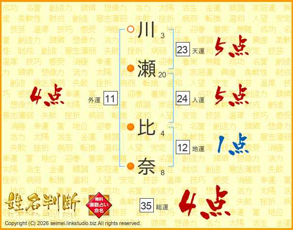 川(3画)瀬(20画) 比(4画)奈(8画)