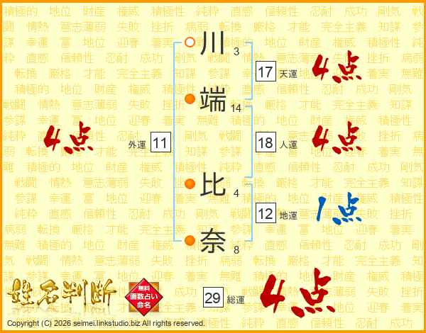生活面を象徴する運勢です。外部から受ける影響力を表し、結婚運、家庭運や職場、環境への順応性を表します。総運から人運を引いた画数。姓や名が1文字の場合を除く。
