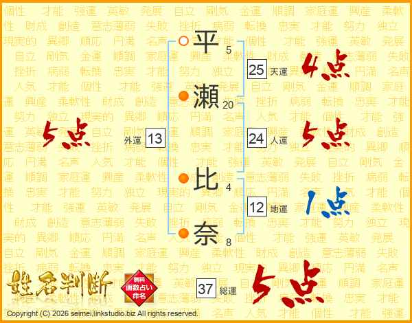 平(5画)瀬(20画) 比(4画)奈(8画)