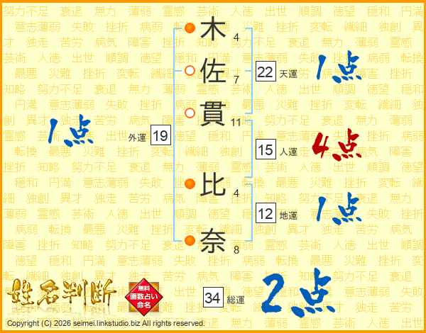 木(4画)佐(7画)貫(11画) 比(4画)奈(8画)