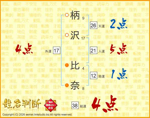柄(9画)沢(17画) 比(4画)奈(8画)