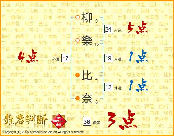 柳(9画)樂(15画) 比(4画)奈(8画)