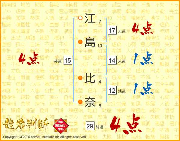 画数の奇数(○陽)と偶数(●陰)の配列で吉凶を占います。どちらかにかたよる名前は大凶名で避ける必要があります。画数の奇数偶数。