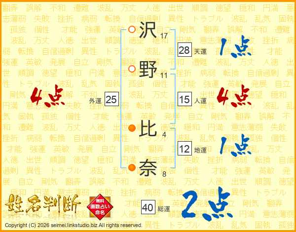 生活面を象徴する運勢です。外部から受ける影響力を表し、結婚運、家庭運や職場、環境への順応性を表します。総運から人運を引いた画数。姓や名が1文字の場合を除く。