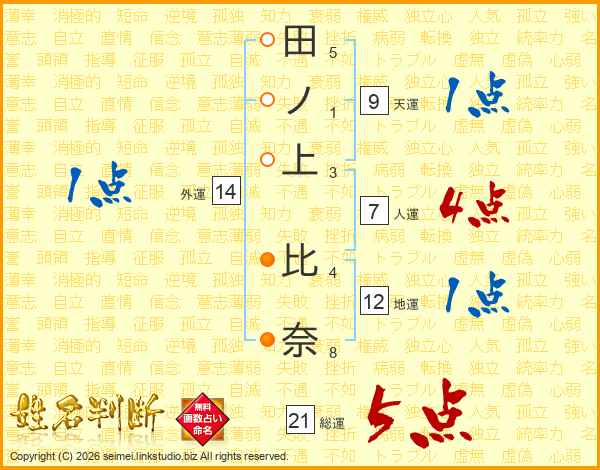 田ノ上比奈さんの総運は21画の5点!