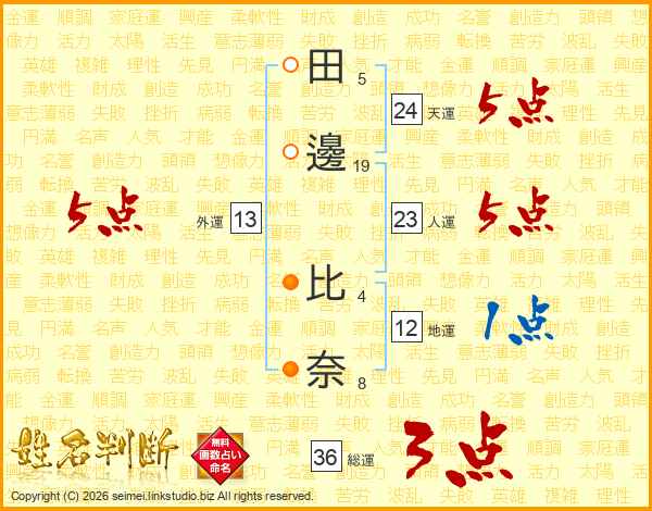 生活面を象徴する運勢です。外部から受ける影響力を表し、結婚運、家庭運や職場、環境への順応性を表します。総運から人運を引いた画数。姓や名が1文字の場合を除く。